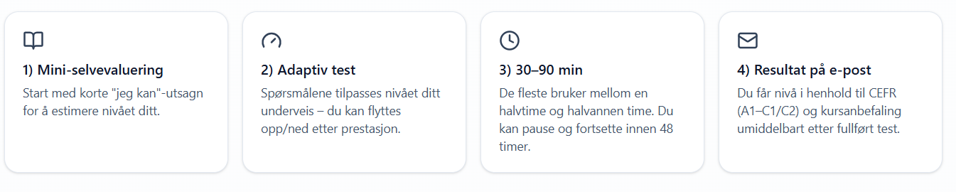 Ta vår profesjonelle nivåtest og få en presis vurdering av ferdighetene dine på 30–90 minutter.